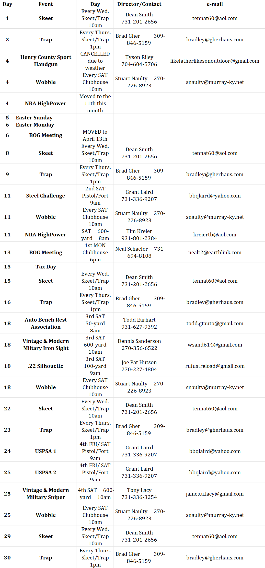 Calendar of Events